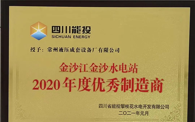 喜訊 | 常州液壓成套設備廠有限公司榮獲“金沙江金沙水電站2020年度優(yōu)秀制造商”稱號!